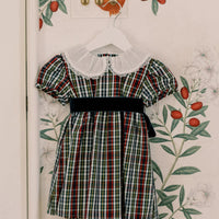 Embrace the spirit of the season with the timeless allure of tartan, its rich colour palette a quintessential nod to the festive months. The Alicia Baby Girl Set beautifully embodies La Coqueta's commitment to the finer details, crafted from luxurious cotton adorned with a charming tartan check in rich hues of burgundy, navy, and yellow This classic two-piece dress set offers an airy, relaxed feel, perfect for the festive season. It has short, capped sleeves, and an elegant Peter Pan collar delicately outlined with French lace. The top fastens at the back with La Coqueta's signature mother of pearl button placket and is fully lined in pure cotton to ensure comfort and gentle coverage for your little one. It has a beautiful wide-panel velvet ribbon in classic navy cotton velvet that ties at the back in a floppy bow, and the matching bloomers feature an elasticated waistband, making diaper changes effortless while maintaining a chic look.