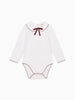 Elevate your little one's growing nursery wardrobe with La Coqueta's Lirio Long Sleeve Baby Body Vest. It is crafted from premium cotton in soft white, with dropped shoulders, long sleeves and nickel-free poppers at the crotch and back for fuss-free changing all day long. In true La Coqueta style, it has a flat Peter Pan collar decorated with burgundy red piping trims, perfectly matching the tonal scalloped embroidery finishes on the cuffs and legs. Loved by baby girls and boys alike, this is a piece that guarantees plenty of wear all year round.