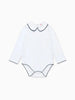 La Coqueta's Patricio Baby Body Vest is the perfect foundation when building your baby's growing nursery wardrobe, offering endless style pairings for whatever the occasion. It is crafted from premium cotton jersey in classic white, with dropped shoulders, long sleeves and nickel-free poppers at the crotch and back for fuss-free changing all day long. In true La Coqueta style, it has a flat Peter Pan collar decorated with rich navy blue piped trims, perfectly matching the tonal scalloped embroidery finishes on the cuffs and legs. This unisex piece is perfect for the cold-weather season and passing down to younger siblings for years to come.