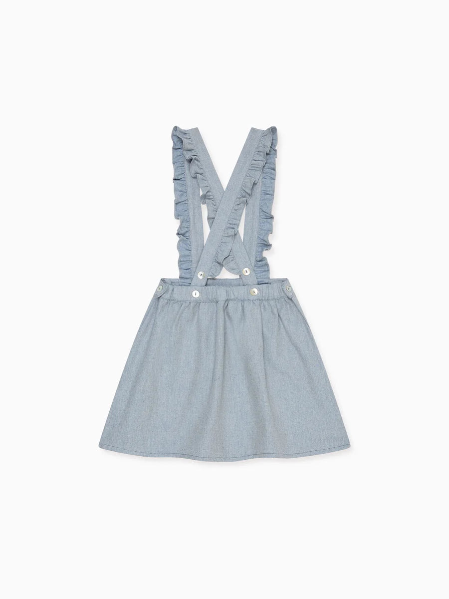 A perennial favourite that guarantees year-round wear, La Coqueta's Agata Girl Pinafore Skirt is a fan favourite around the world. This school-friendly dusty blue version is crafted from pure cotton that is lightweight and breathable, with a super soft texture that ensures your little girl keeps comfortable all day long. It features a flouncy silhouette with a floaty skirt, and elegant crossover straps detailed with artfully ruffled trims. It fastens at the back and sides with signature mother of pearl buttons and is fully lined with pure cotton for extra coverage.