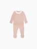 The perfect gift for a new arrival or parent-to-be, it is knitted in Spain using pure cotton in a wavey garter stitch with chunky overlocked trims on the cuffs and hem. A relaxed two-piece set with long sleeve top and trousers with attached booties, button-up at the back with signature mother of pearl buttons for fuss-free changing when out and about. The Amalia Cotton Baby Set is the perfect outfit for baby's early days, with a natural stretch that grows with your little one and keeps them cosy and comfortable all day long. Decorated with sweet bow details on the top and a frilly cotton puritan collar with lacey trim, this is a set that proves less is sometimes more.