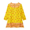 Yellow swing dress with long sleeves and red apple print.