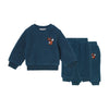 Teddy tracksuit in navy blue with fox decal on crewneck top and pant pocket.