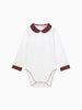 La Coqueta is renowned for its elevated seasonal collections, featuring timeless yet enchanting designs for the whole family. Each piece is crafted to ensure your little one stands out with classic elegance and undeniable charm, designed at our Notting Hill studio and proudly created by artisans at our family-owned ateliers. The Bastia Baby Body Vest is the perfect addition to your baby's wardrobe, embodying charm and practicality for a variety of occasions. This versatile bodysuit is expertly crafted from premium cotton jersey, ensuring softness and comfort against delicate skin, designed with practical nickel-free poppers at the crotch and back for fuss-free changing throughout the day. It has long sleeves and dropped shoulders to keep little ones warm and cosy, and is perfect for layering under dungarees and knitwear in colder climates. True to La Coqueta's attention to detail, this bodysuit is finished with a red tartan Peter Pan collar and cuffs, traced with beautiful tonal scalloped embroidery that adds a refined touch to an everyday essential. Perfect for new arrivals, or yourself, it's a must-have piece for celebrating a baby's first Christmas with loved ones.