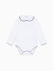 Elevate your little one's growing nursery wardrobe with La Coqueta's Lirio Long Sleeve Baby Body Vest. It is crafted from premium cotton in soft white, with dropped shoulders, long sleeves and nickel-free poppers at the crotch and back for fuss-free changing all day long. In true La Coqueta style, it has a flat Peter Pan collar decorated with navy blue piping trims, perfectly matching the tonal scalloped embroidery finishes on the cuffs and legs. Loved by baby girls and boys alike, this is a piece that guarantees plenty of wear all year round.