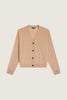 A loose fitted beige and pink merino wool cardigan. V-neck cut with buttoned opening down the front.