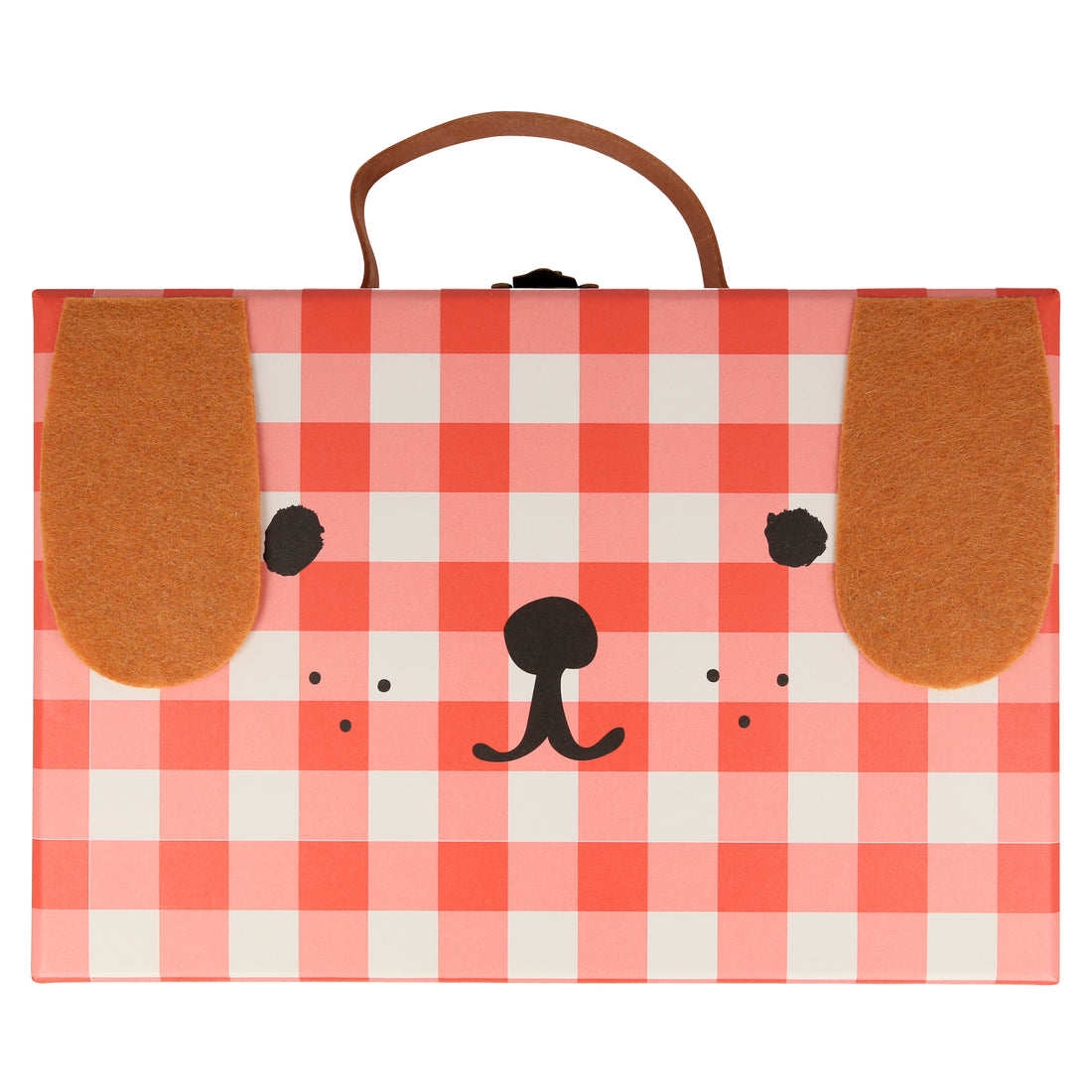 - The suitcase features an adorable dog face and brown floppy felt ears